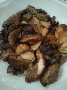 Tal y como dice el “chef”, primero los higaditos bien friticos y luego las setas para bañarlos en sus babitas. Pues, ¿qué más puedo decir? el higado, cuanto más pequeños sean los trocitos en que lo cortemos, más crujiente quedará. Una vez lo veais dorado, añadir los boletus, y en el poco tiempo que tardan en hacerse, los higaditos ya se han puesto crujientes.