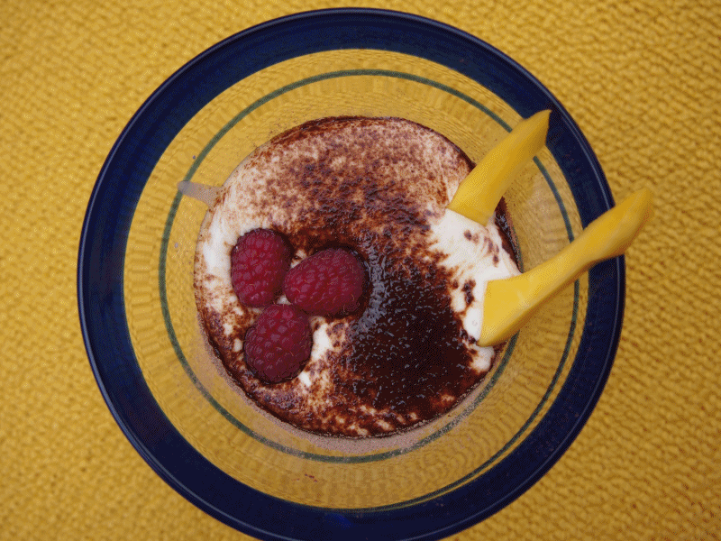 b) Otra sugerencia es poner la crema de tiramisú en las copas, y servir con trozos de frutas (el mango y la frambuesa casan muy bien con esta crema).