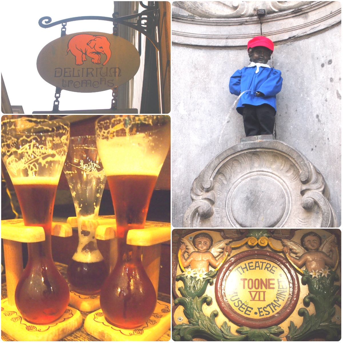 Situándonos en la Gran Place, de espaldas al Ayuntamiento, la estrecha calle de enfrente, “Des Bouchers“, está plagada de restaurantes para turistas, pero es agradable, ahí es típico comer una olla de mejillones y un plato de patatas fritas (“moules et frites“). Justo en esa calle (segunda manzana) se encuentra una de las dos entradas al mítico bar “Toone“, es difícil de ver, pero mirando hacia arriba, hay un cartel anunciándolo. Se trata de uno de los bares más antiguos, lleno de marionetas, y con un antiguo teatro de marionetas en la planta baja (aún siguen haciendo obras de teatro en la parte superior). Ahí podeis pedir la cerveza “Kwak“, de vaso de culo redondo con soporte en madera.
