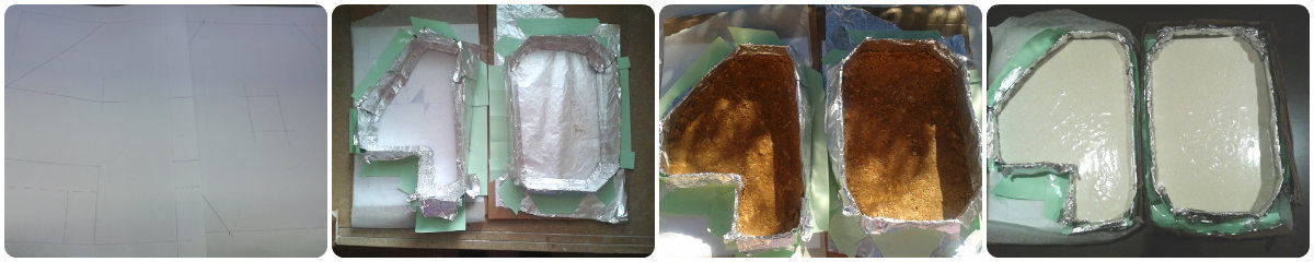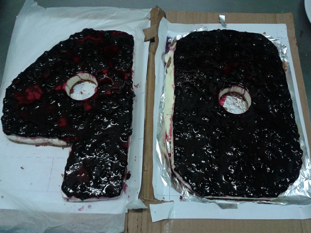 No podía faltar en un cumpleaños, y como 40 es un número redondo, quería que fuera una tarta especial. La Tarta de Queso (click) le encanta, así que pensé en una en forma de 40. Como no encontré moldes, y 60 eran los asistentes, tenía que ser una tarta muy grande. Así que, confiando en que la gelatina mantendría la forma de la tarta, mis amigas y yo ideamos hacer los moldes con papel y cartón…y funcionó! Unas bengalas que encendió mi primo y así quedó la tarta!