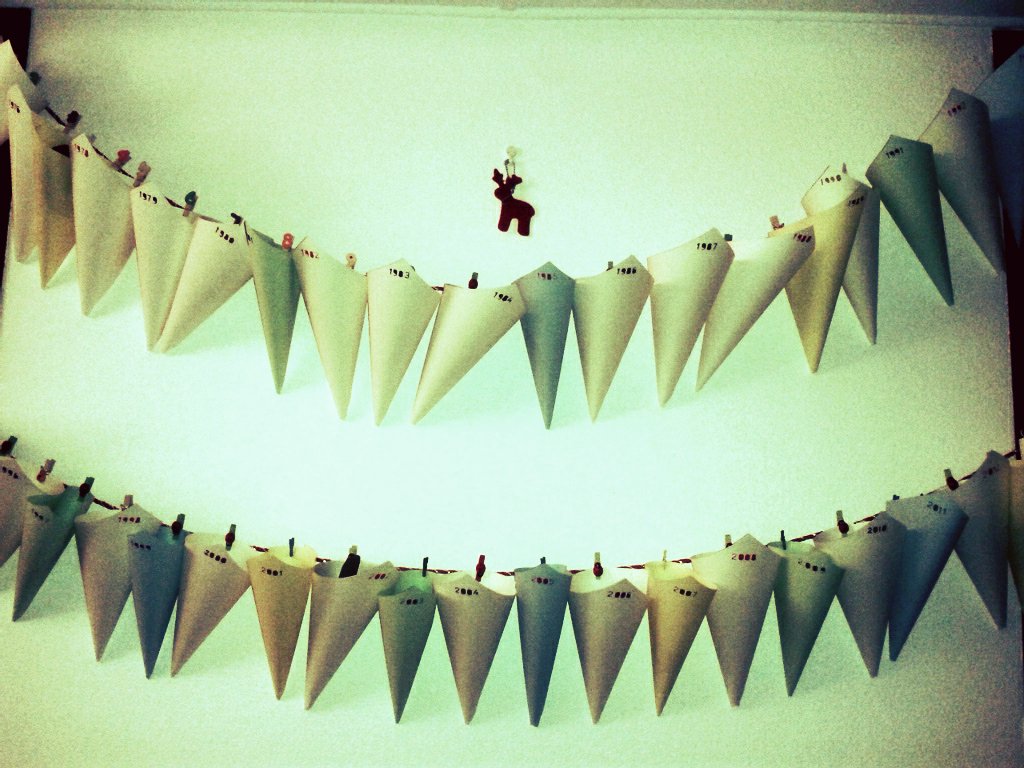 Realmente los preparativos comenzaron 40 días antes del cumple. Se trata de una especie de calendario de adviento pero dirigido al cumpleañero; y en lugar de una chocolatina cada día, ¿qué mejor que una frase positiva, optimista, enérgica o romántica para esa cuenta atrás? 40 casillas (o conos), cada una marca los años, desde 1974 hasta el presente, y dentro se encuentra la frase. Es verdad que 40 son muchas frases, pero como hay fechas en las que recordar momentos especiales, o carnets de estudiante y dni caducados de cuando era jovencito, con lo que el número de frases se reduce, y además siempre está Mr. Wonderful para facilitarte las cosas.